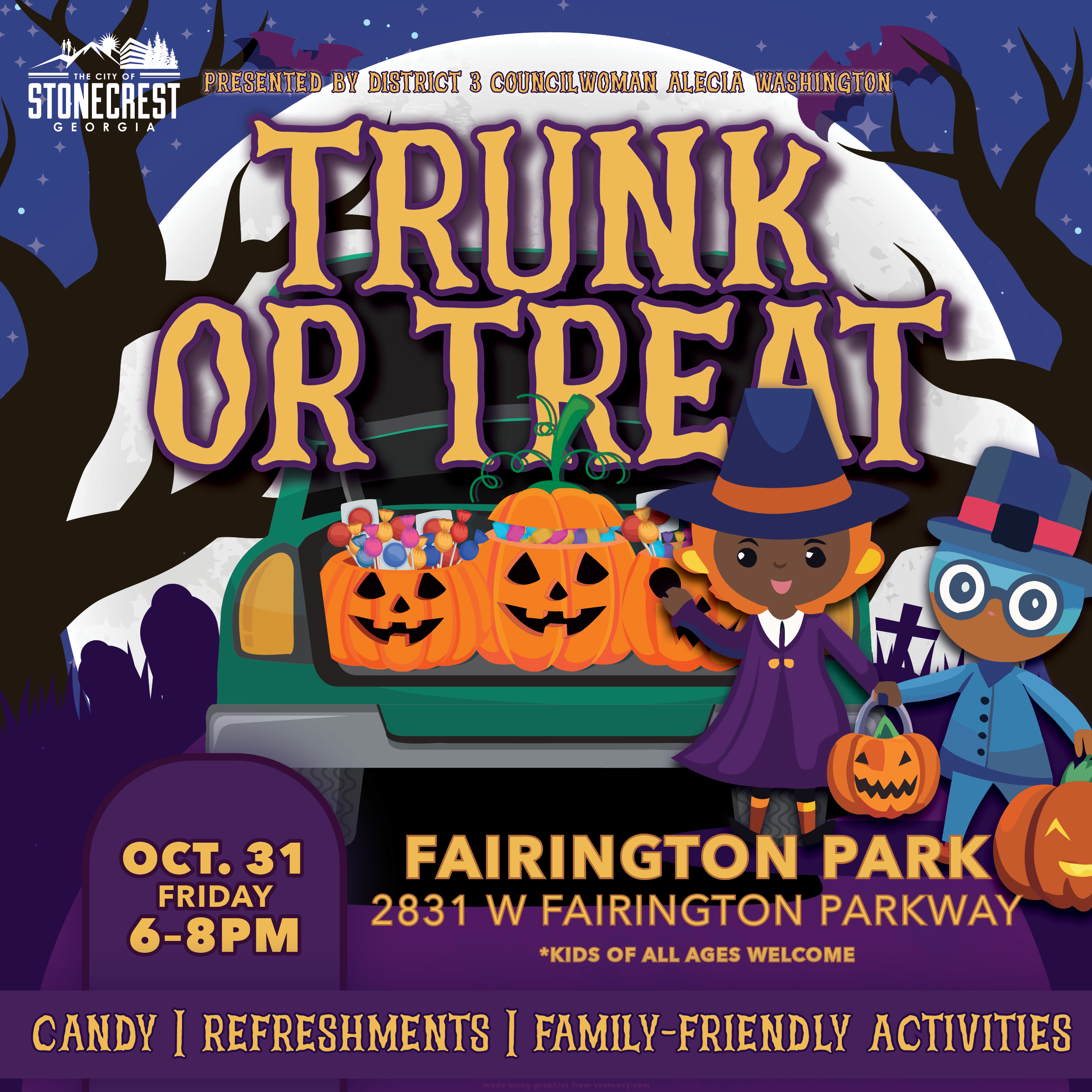 City of Stonecrest, District 3 Councilwoman Alecia Washington, invites you to join a family-friendly Trunk or Treat event.