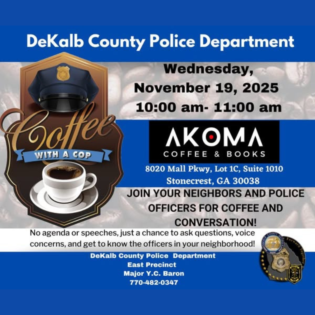 Connect with the DeKalb County Police Department’s East Precinct for coffee and conversation. Meet our Command Staff, police officers, and detectives who serve your communities.