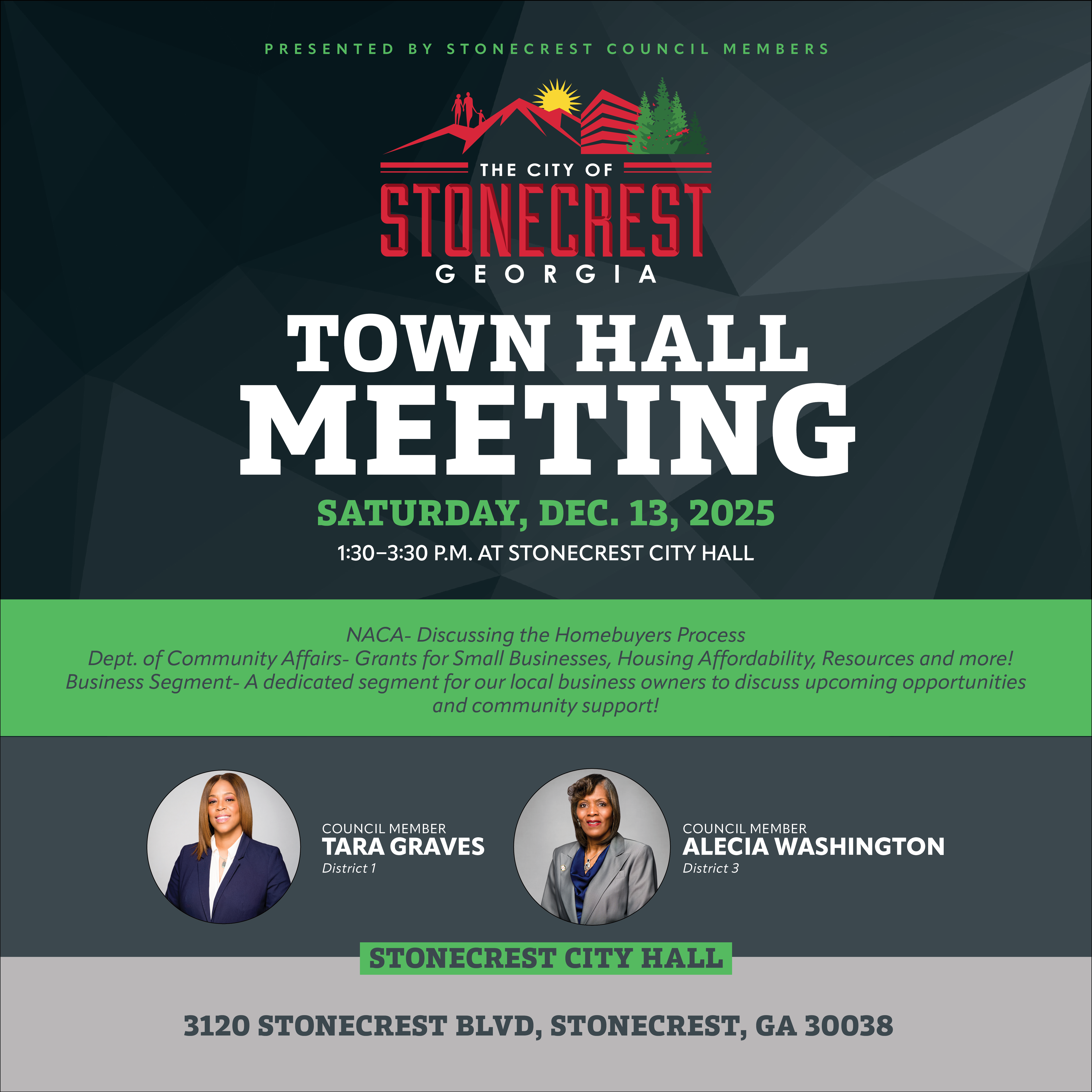 Join Stonecrest Council Members Tara Graves (District 1) and Alecia Washington (District 3) for an important Town Hall Meeting!