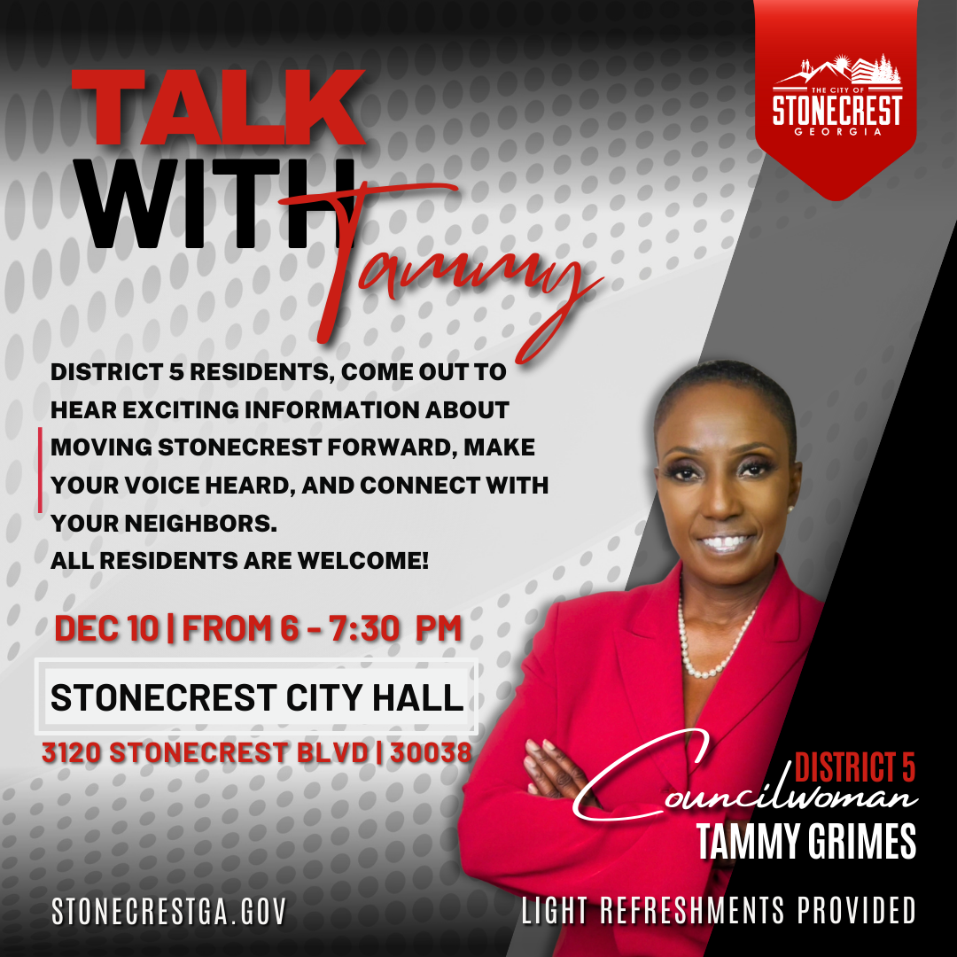 District 5 residents, you're invited to come and "Talk With Tammy" to hear exciting information about moving Stonecrest forward, make your voice heard, and connect with your neighbors.
