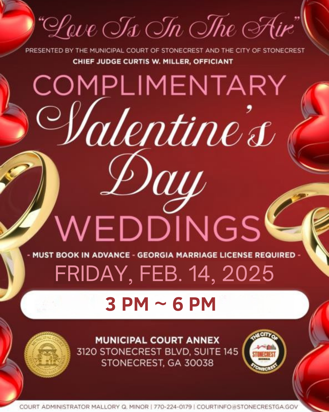 The Municipal Court of Stonecrest, in partnership with the City of Stonecrest, is excited to offer complimentary weddings this Valentine’s Day!