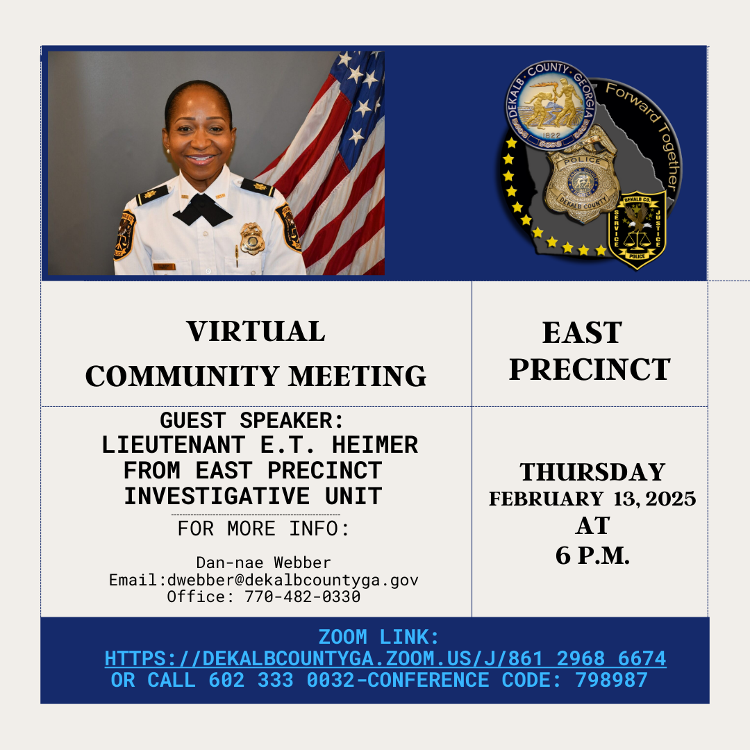Join DeKalb County Police East Precinct for a Virtual Community Engagement Meeting.