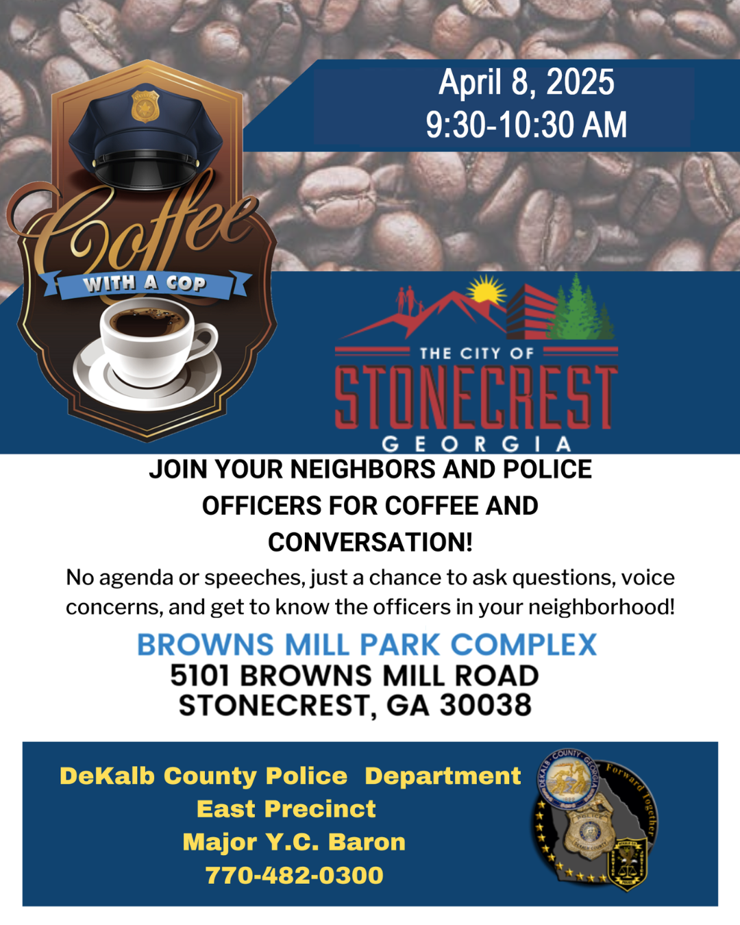 Join Dekalb County PD's East Precinct for Coffee With a Cop on Tuesday, April. 8, 2025, from 9:30 - 10:30 a.m.