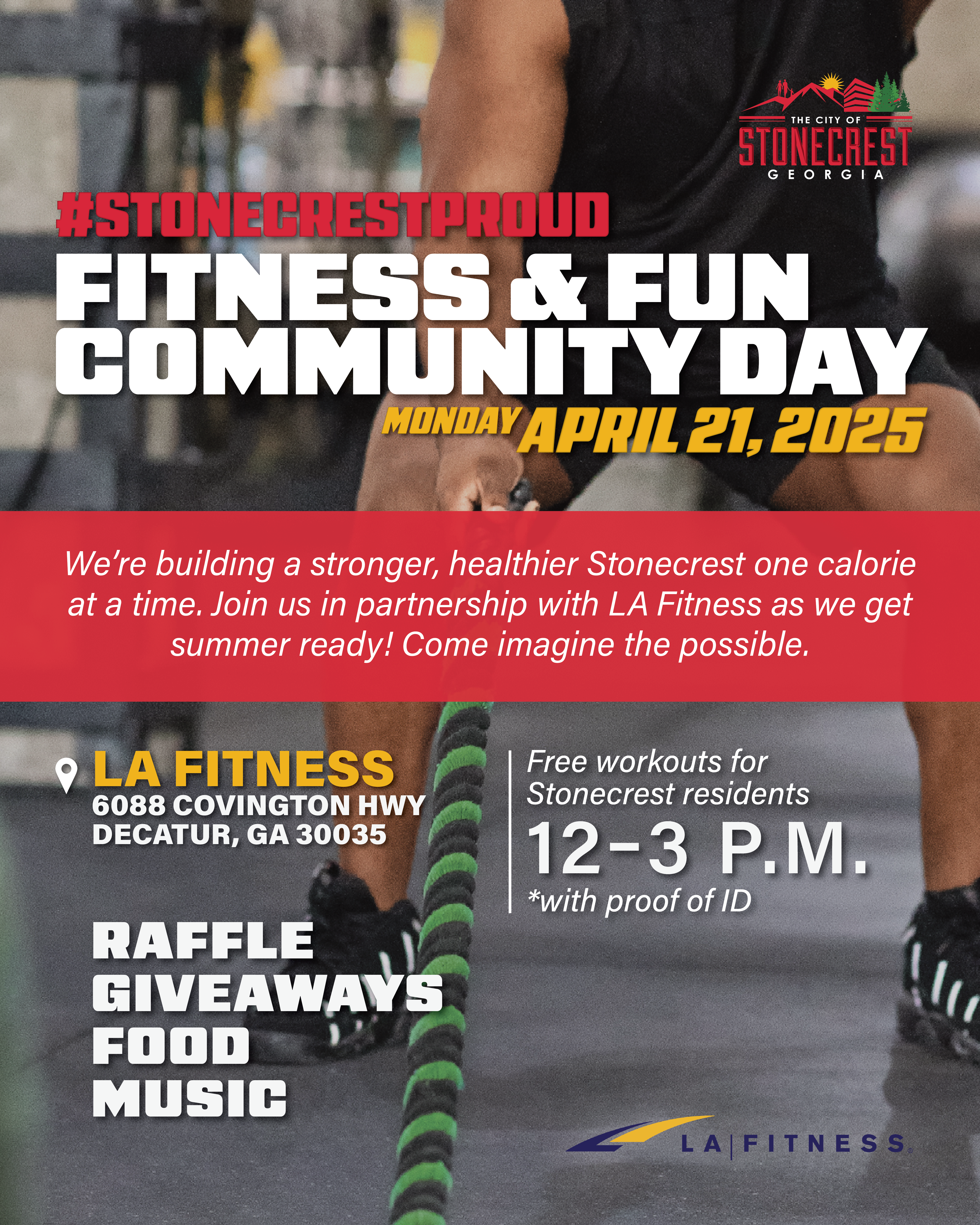We’re partnering with LA Fitness to bring you FREE workouts from 12-3 p.m. for all Stonecrest residents with proof of ID!