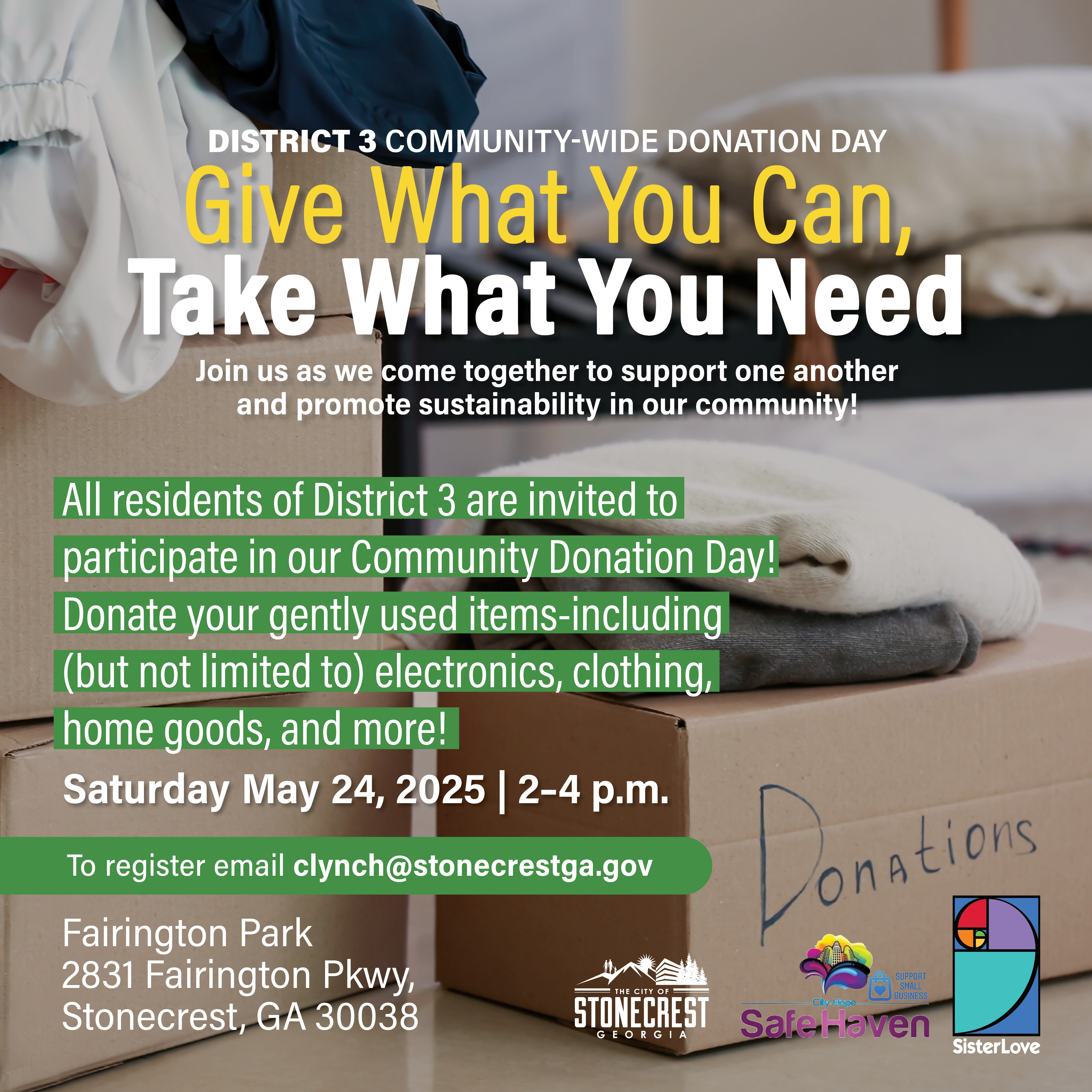 Join Councilwoman Alecia Washington for a District 3 Community-Wide Donation Day, on May 24, 2025, from 2-4 p.m. All residents of District 3 are invited to participate!